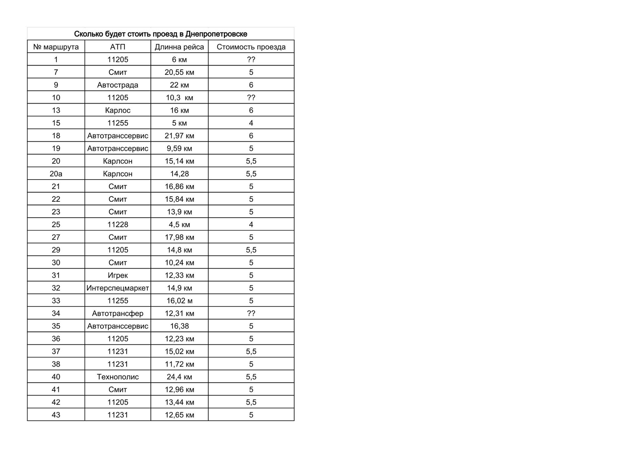 Предварительная стоимости проезда по маршрутам города в таблице по ссылке http://goo.gl/GrFf7B