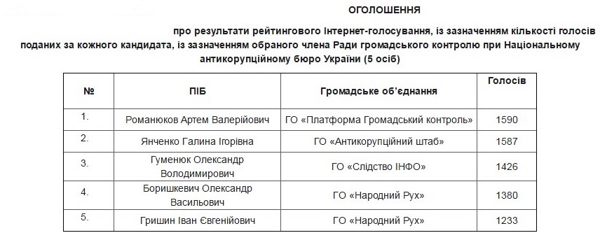 Согласно данным официального сайта НАБУ, он занял первое место по итогам голосования, набрав 1590 голосов.