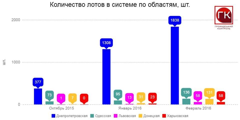 Так, несмотря на бравады Львовского губернатора и Львовского мэра, общее число завершенных лотов за февраль во этой области в 30 раз меньше, чем в Днепропетровской. Как следствие, экономия во Львовской области за февраль составляет всего 550 тысяч грн. против 9,74 млн. грн. в Днепропетровской.