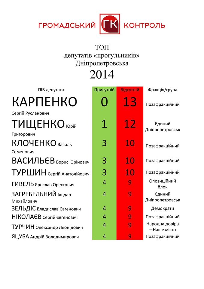 P.P.P.S. Эту публикацию мы сделали для того, чтобы побудить депутатов активнее посещать сессии и комиссии городского совета. В 2013 году система электронной регистрации иногда давала сбои, поэтому в рейтинге могут быть неточности. В 2015 году после каждой сессии горсовета публикуется список присутствовавших, мы будем внимательно следить за этой статистикой.